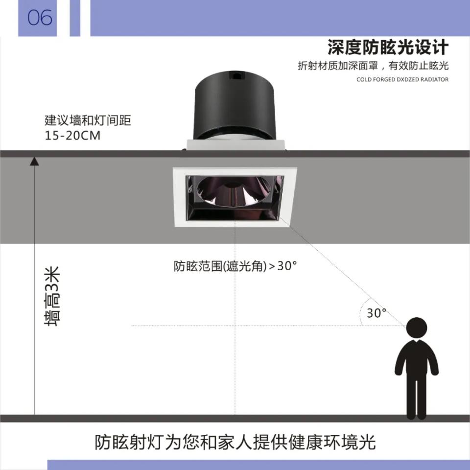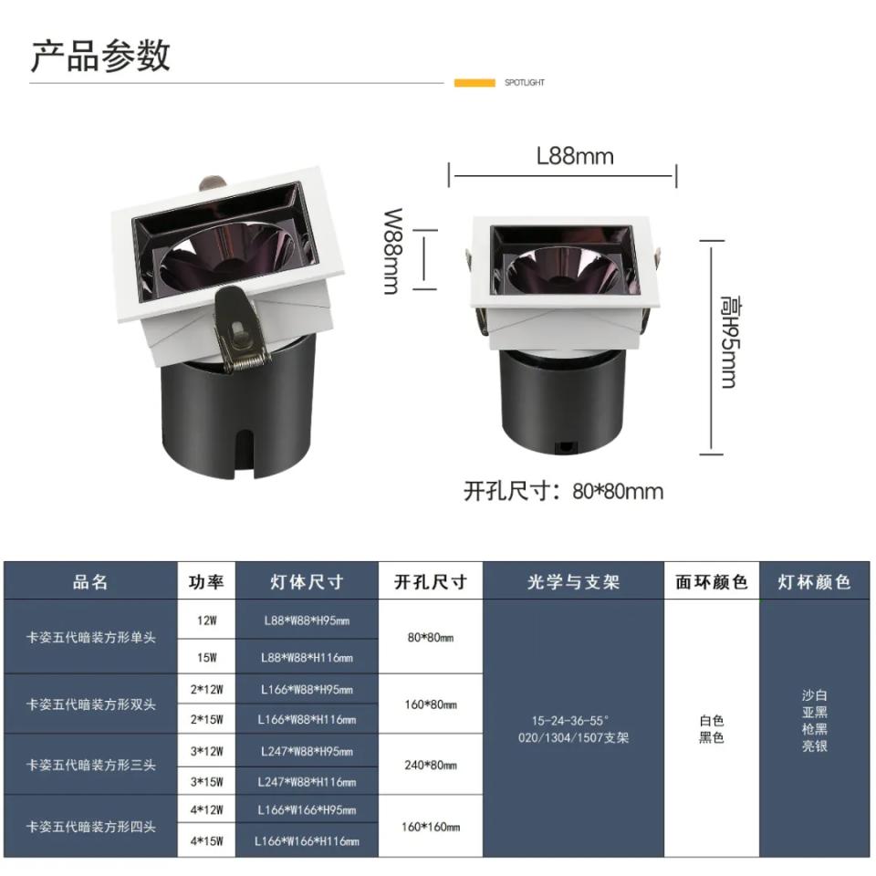 1304支架36º角防眩射灯卡姿5代射灯暗装方形单头款