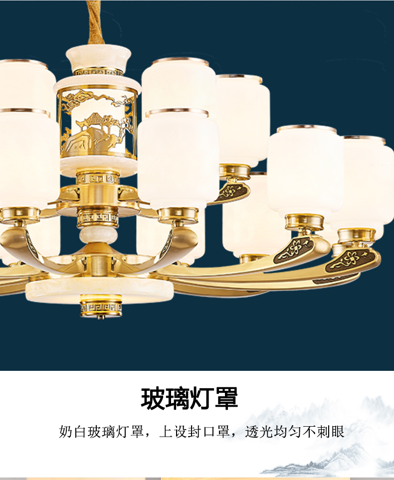 全铜灯臂+玉石锅底+玻璃灯罩+铁艺