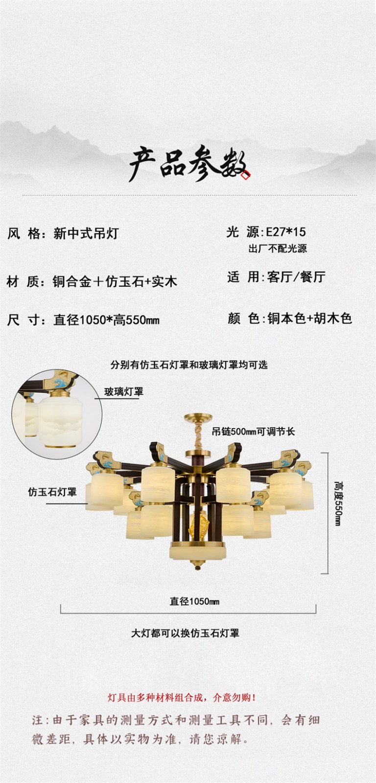 • 光源: E27灯头光源*15个(不含光源)