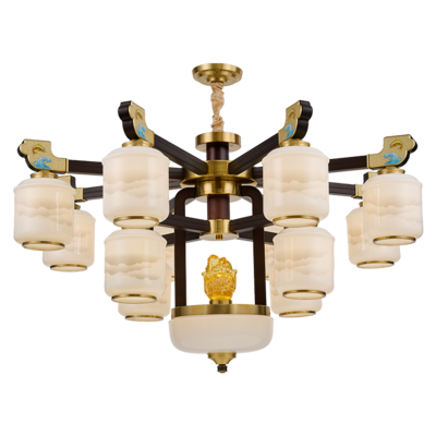 新中式铜合金+木+玻璃罩灯体 客厅餐厅书房卧室简约吊灯2265