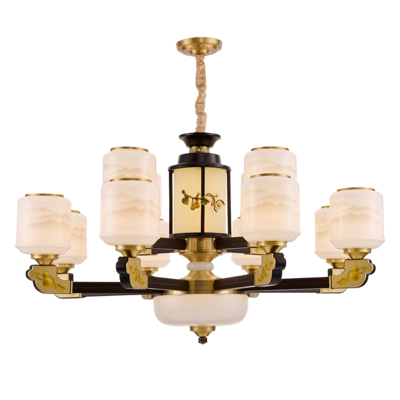 新中式铜合金+木+玻璃罩灯体 客厅餐厅书房卧室简约吊灯1166