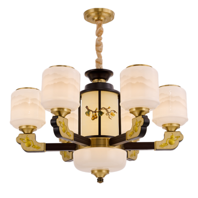 新中式铜合金+木+玻璃罩灯体 客厅餐厅书房卧室简约吊灯1166