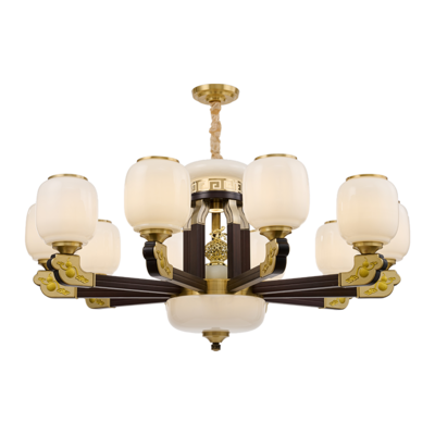 新中式铜合金+木+玻璃罩灯体 客厅餐厅书房卧室简约吊灯3366