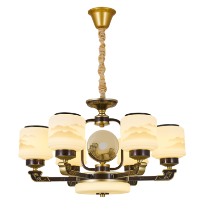 新中式锌合金封口防尘玻璃山水画灯罩天然玉石真玉中柱奢华雕刻粗灯臂高贵耐看吊灯9595