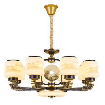 新中式锌合金封口防尘玻璃山水画灯罩天然玉石真玉中柱奢华雕刻粗灯臂高贵耐看吊灯9595