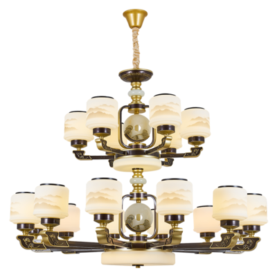 新中式锌合金封口防尘玻璃山水画灯罩天然玉石真玉中柱奢华雕刻粗灯臂高贵耐看吊灯9595
