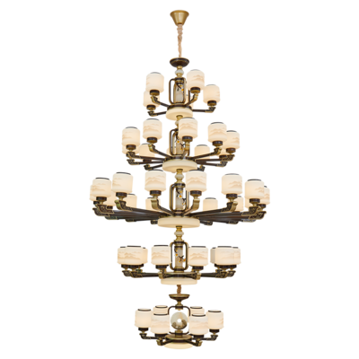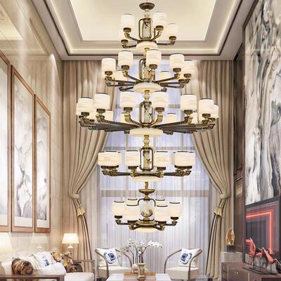 新中式锌合金封口防尘玻璃山水画灯罩天然玉石真玉中柱奢华雕刻粗灯臂高贵耐看吊灯9595