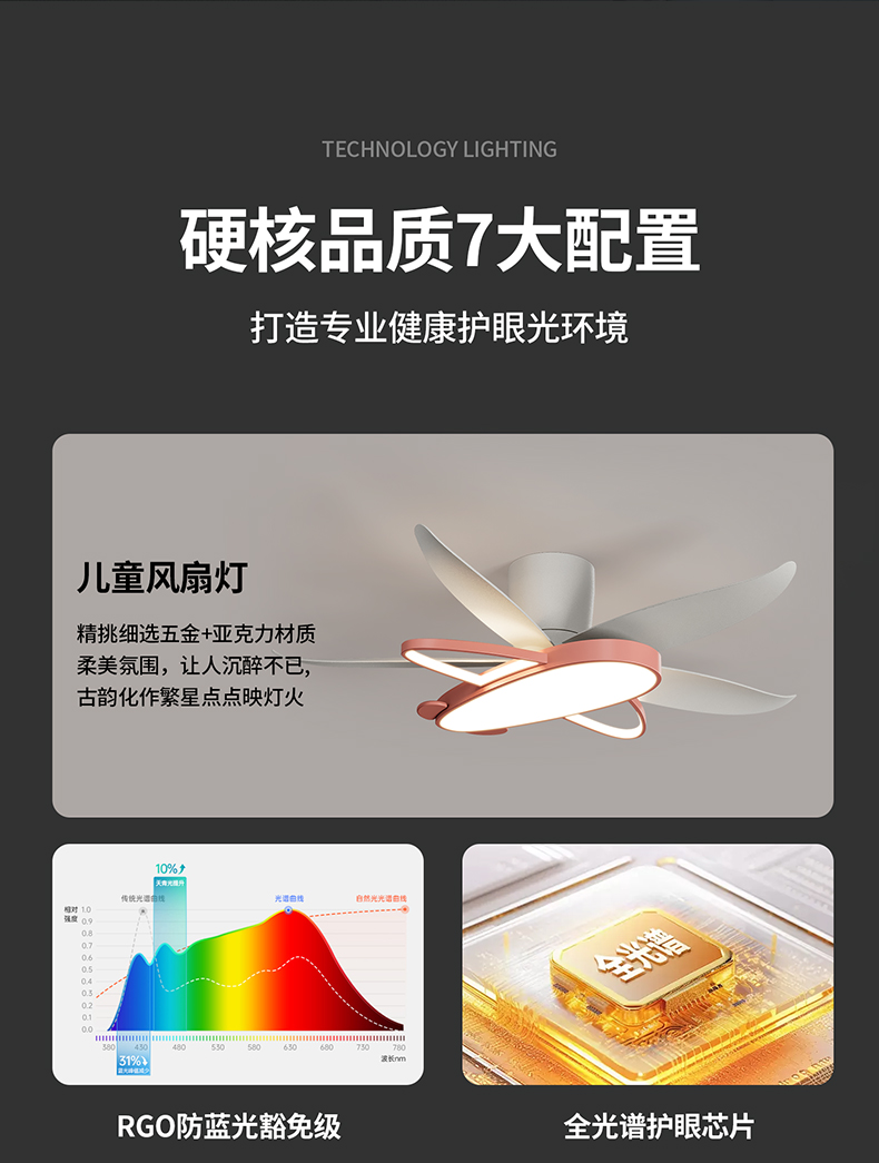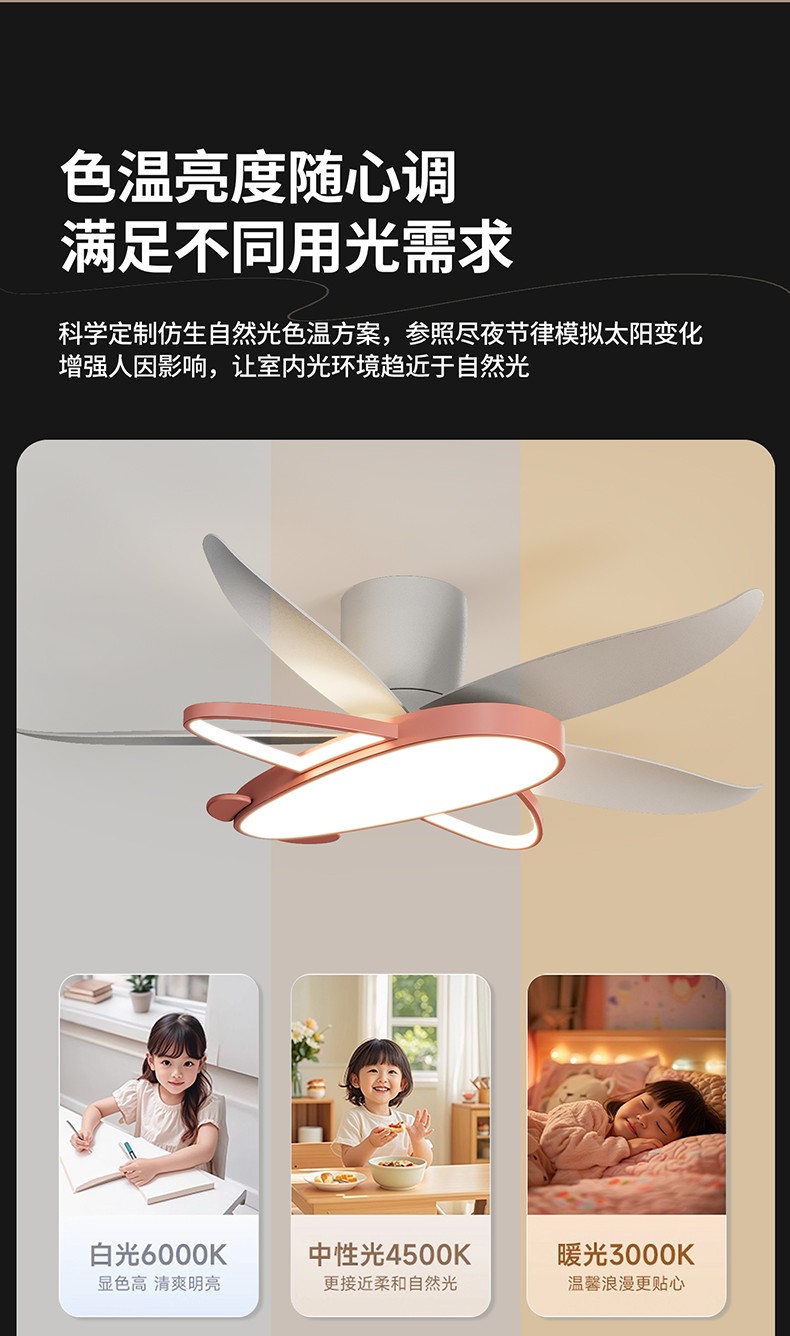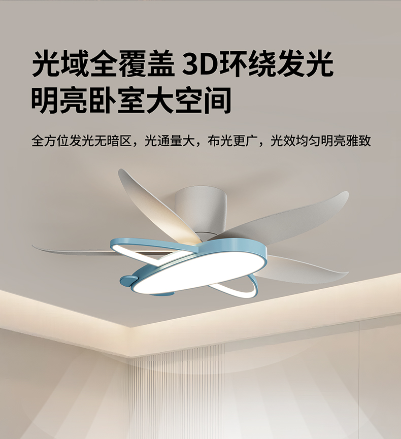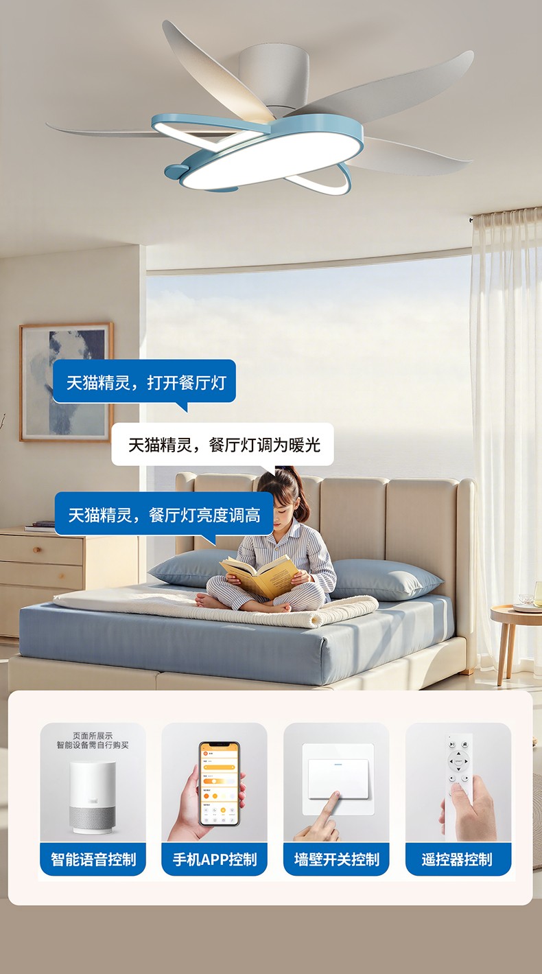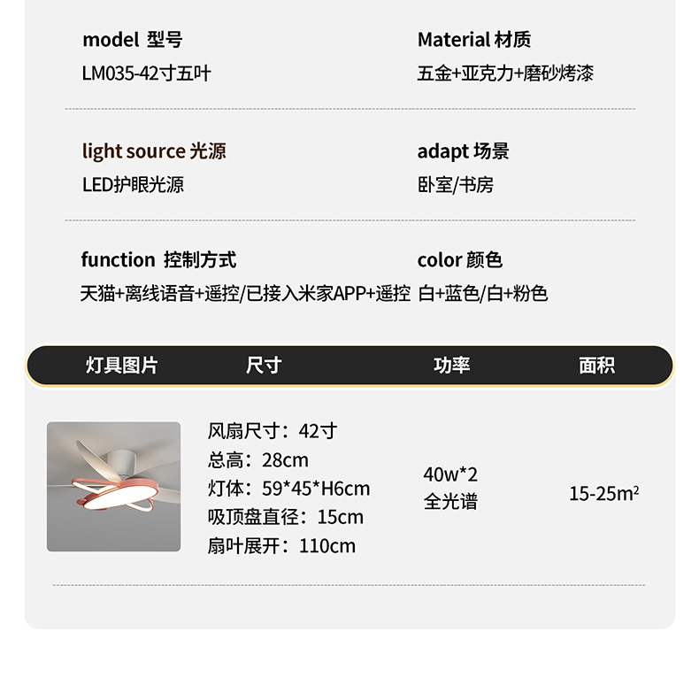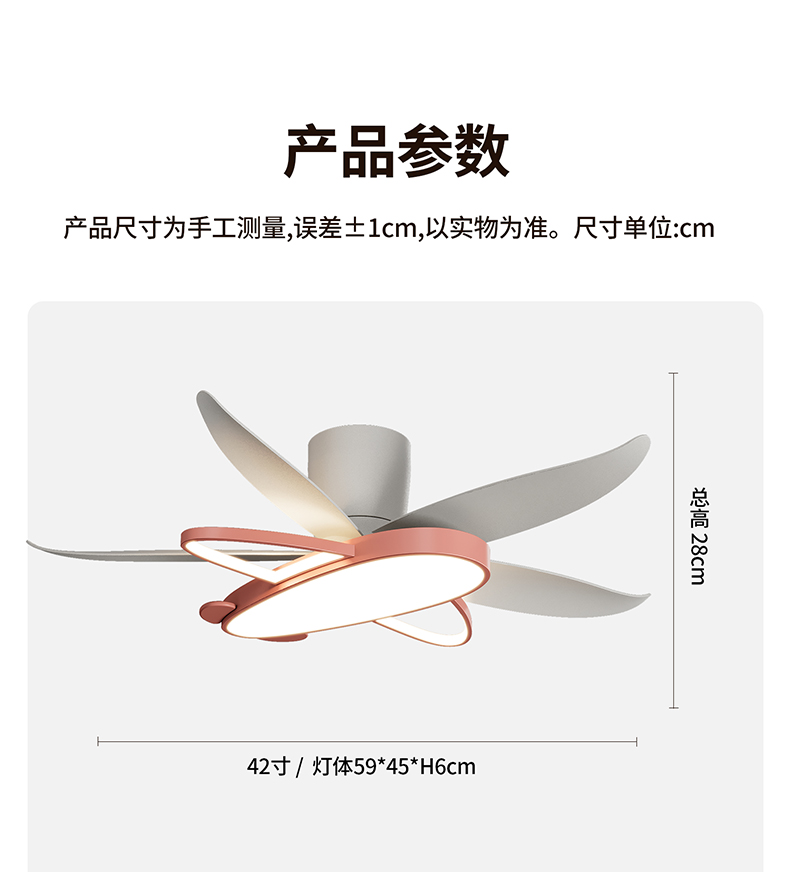 42寸 总高:28cm 灯体:59*45*H6cm 扇叶展开:110cm 40W 天猫+离线语音