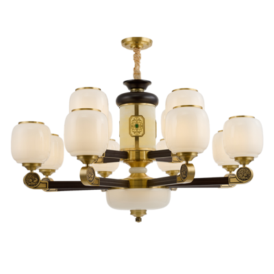 新中式铜+木+玻璃罩灯体 客厅餐厅书房卧室简约吊灯8367